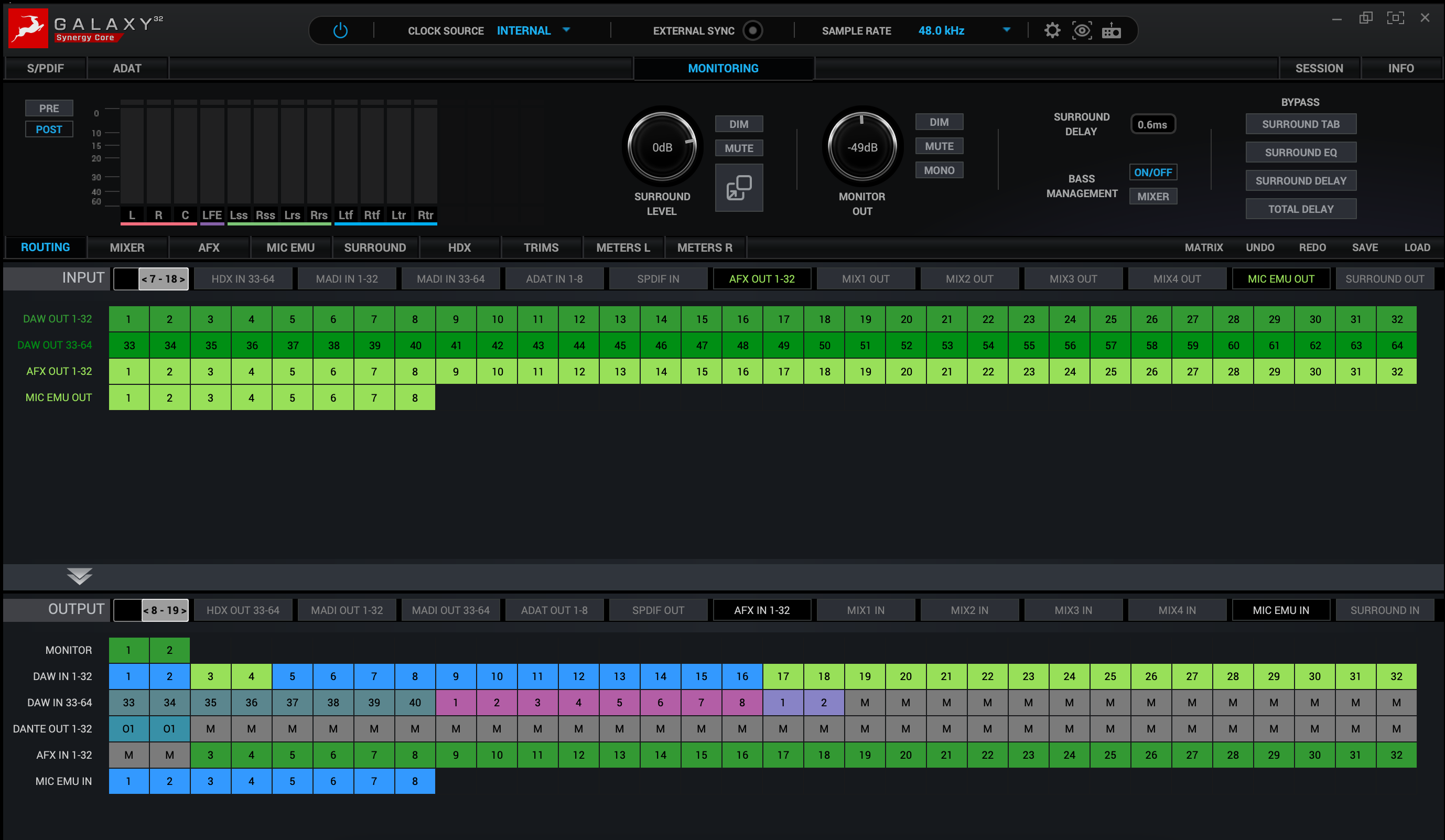 ⦁ The Emu Mic In and Emu Mic Out rows are hidden by default in the Galaxy Control Panel. Click on these rows to reveal and activate them.