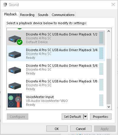 3. Asegúrate de que los canales 1/2 de Discrete 4 Synergy Core Playback estén seleccionados como dispositivo de reproducción predeterminado para una experiencia de reproducción fluida. Lo mismo ocurre con la pestaña Grabación.